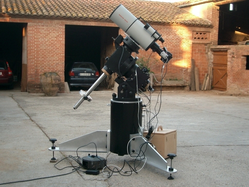 En el peu hi ha la resta d'electrònica i es connecta a aquest conjunt amb cables de només 300 mm de longitud. En el peu hi ha un HUB USB i dos convertidors USB-RS232. Això em permet connectar l'ordinador al peu, per la part inferior, i només amb un cable USB tinc control de la muntura, l'auto guia, el sistema motoritzat d'enfocament, i la càmera principal. A més, a l'ordinador hi tinc el RealVNC, i amb l'ús de la wifi de casa utilitzo tot el sistema en mode remot (tot i ser només uns metres), però com a mínim no passo fred al hivern.